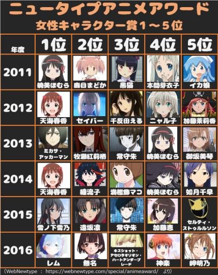 接著是角川公司出版的日本三大動漫雜誌之一《NEWTYPE》的人氣女性角色變遷表。該表格列出的是2011年至2016年間《NEWTYPE》評選出的年度人氣女性角色前5名。